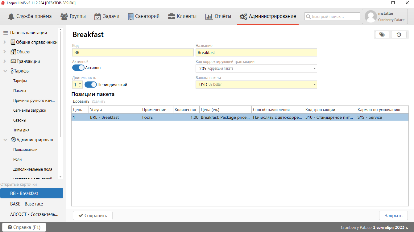 | День | Порядковый номер дня проживания, на который начислится услуга при условии, что мы не назначим пакет в брони через изменение условий проживания и выбор даты в выпадающем списке "Даты применения изменений с/по". Если у пакета выставлен признак "периодический" и все услуги в пакете имеют порядковый номер дня "1", это значит что каждая услуга будет начислена на каждый день проживания. Если же указать при этом длительность пакета, скажем, "3" (дня), то услуги будут начислятся на каждый третий день начиная со дня заезда. В качестве порядкового номера дня можно указать "РЗ" (ранний заезд) или "ПВ" (поздний выезд), в таком случае услуга будет начислятся на таймлайн (интервал проживания) раннего заезда или позднего выезда. | ||||||||