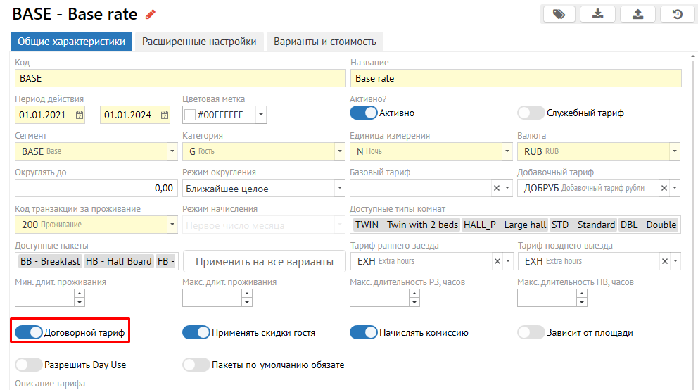 Договорный тариф - переключатель используется для договорных тарифов. В мастере Бронирования данный тариф будет недоступен, если не указана компания, у которой есть договор на данный тариф. Такие тарифы  используются, например, если у объекта с какой-то компанией свои условия и они всегда приезжают по своей цене.