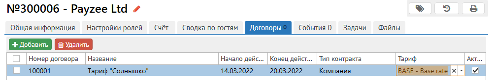 2. В модуле “Клиенты” у Компании на вкладке “Договор” должен быть добавлен договор на соответствующий тариф: