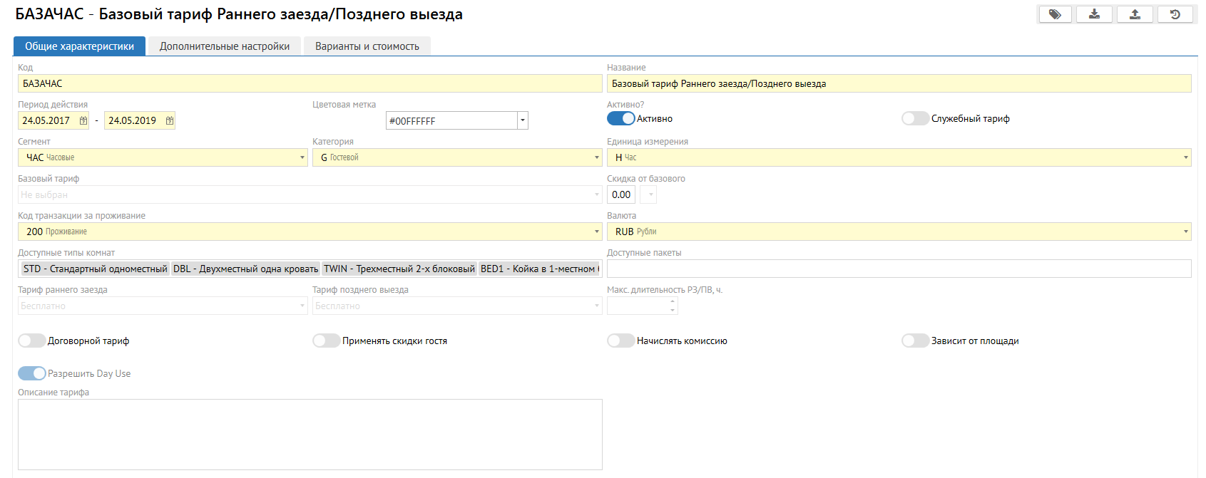 • Тарифы выбираются уже позже, в соответствии с настройками длительности раннего заезда и позднего выезда.