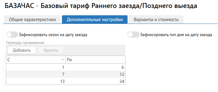 2. В дополнительных настройках тарифа добавить периоды проживания: