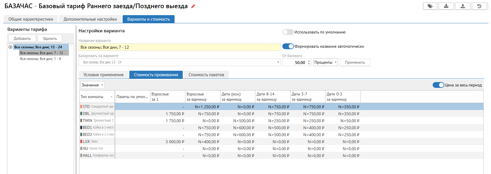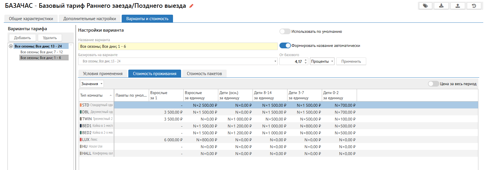 3. На вкладке Варианты и стоимость указать стоимость проживания для  варианта тарифа 13-24. За основу взять вариант 13-24 - стоимость полного дня по тарифу.
