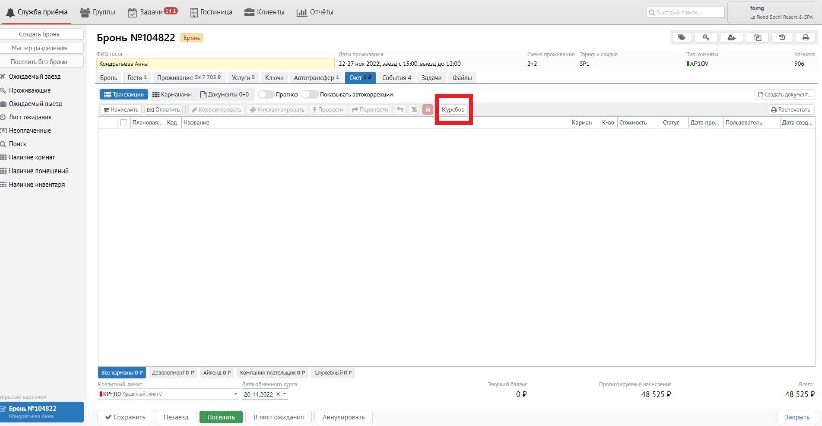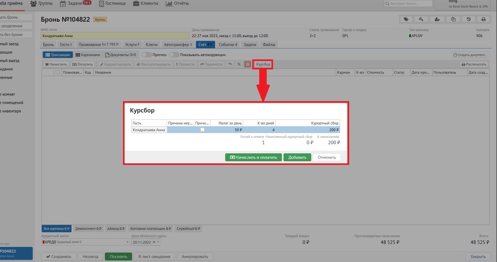 2. При включении модуля «Курортный сбор» во вкладке «Счёт» появляется доп. кнопка «Курсбор».