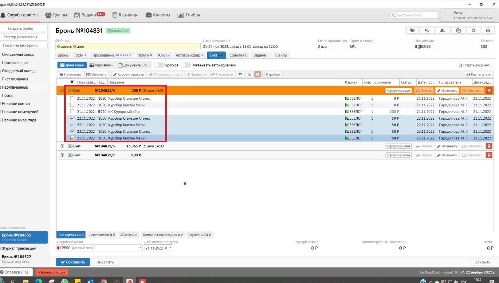3. При нажатии на кнопку «Курсбор» открывается окно, в котором выведен список планируемых начислений по гостям по курсбору.