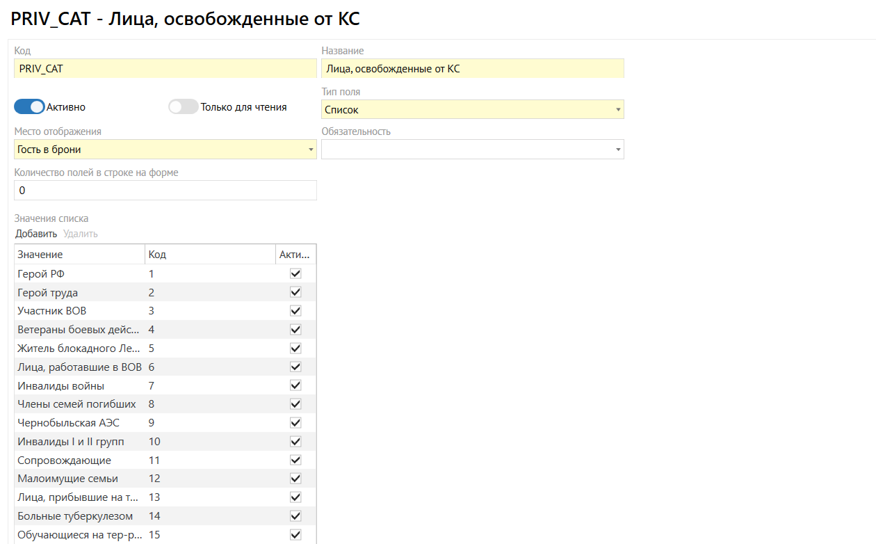 - дополнительное поле с кодом PRIV_CAT, которое будет иметь тип «Список» и отображаться во вкладке «Гости» в брони. В карточке данного дополнительного поля составить перечень причин, по которым гость может не оплачивать курортный сбор, например, гость является Героем России.