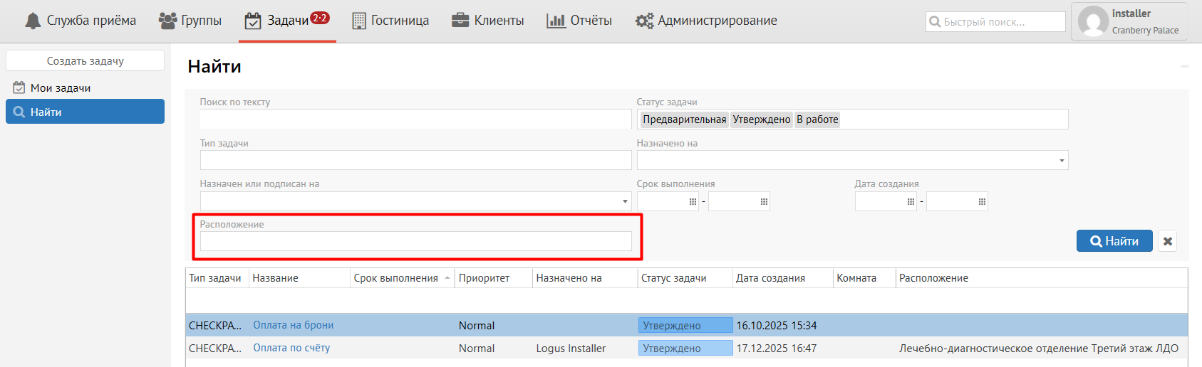 Начиная с версии 3.27.1, на соответствующие вкладки раздела Задачи добавлены фильтры для отбора задач по расположению. В список задач добавлен столбец Расположение.
