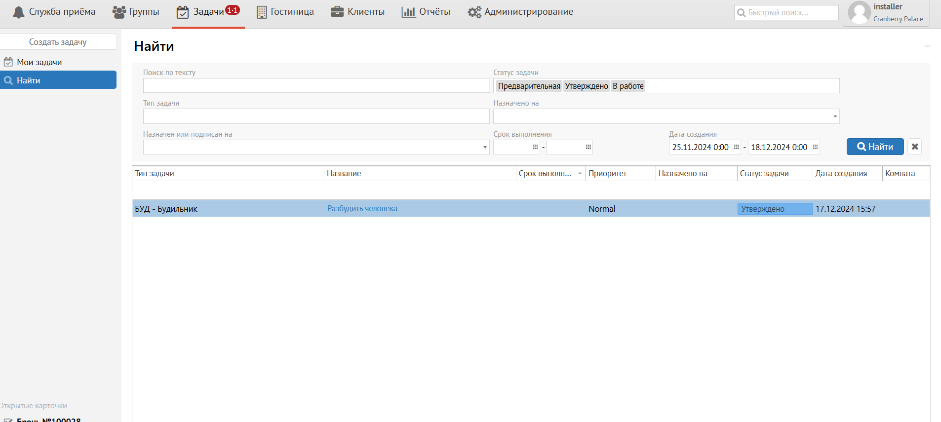 • Статус задачи (множественный выбор, по умолчанию активны: Предварительная заявка, Утверждено, В работе);