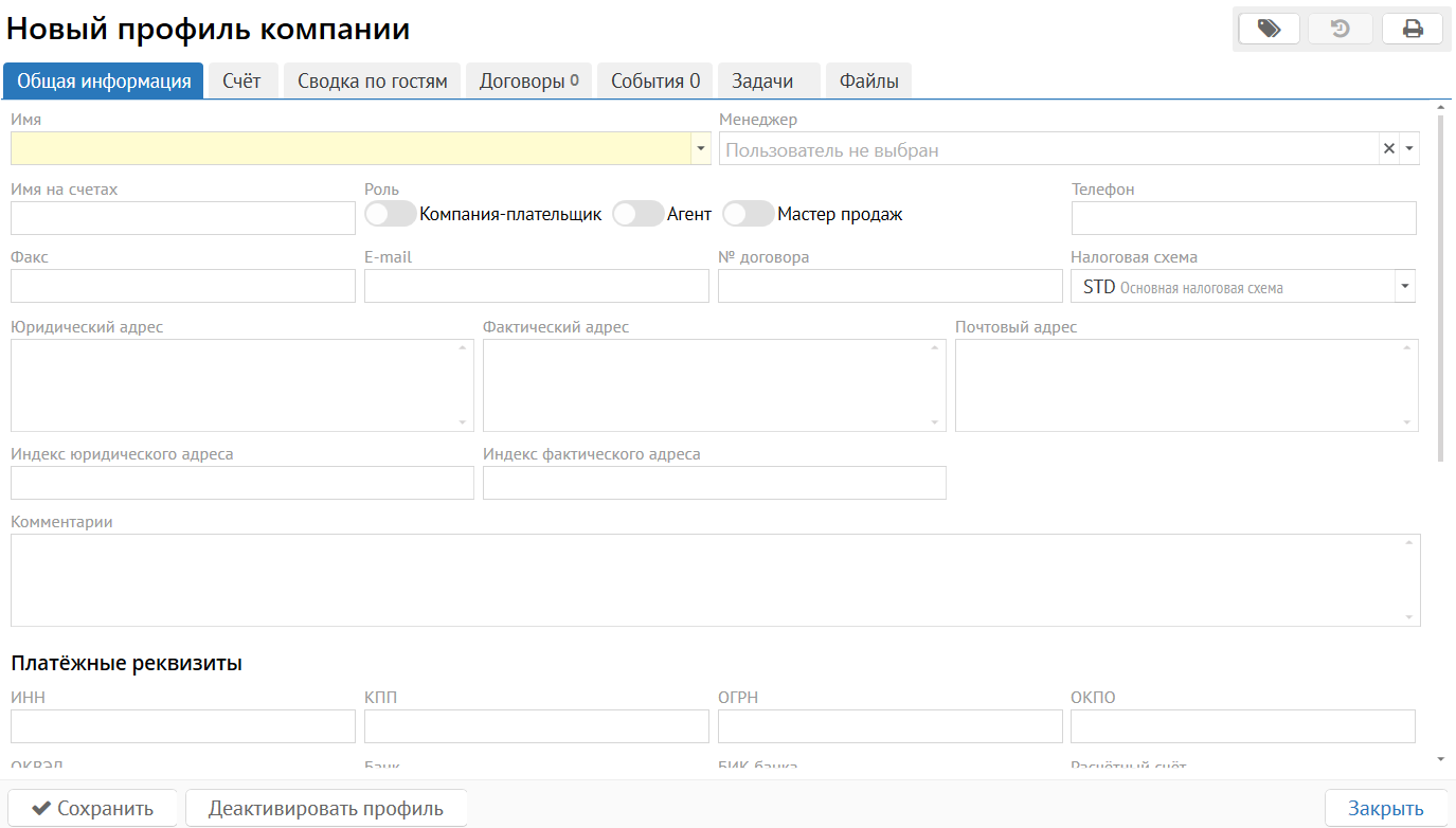 Менеджер - ответственное лицо, которое будет работать с данной компанией. Выбор из списка пользователей, у которых есть право "Менеджер профилей гостей и клиентов".