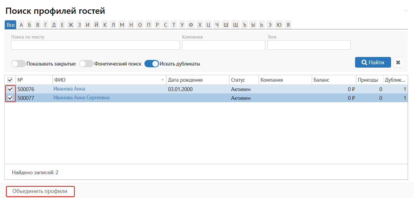 Переключатель "Искать дубликаты" - позволяет искать дубликаты профилей.