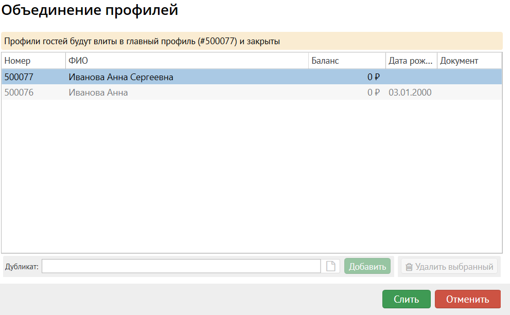 В окне "Объединение профилей" можно дополнительно совершить поиск дублирующих профилей. Для этого в поле "Дубликат" введите данные профиля, выберите соответствующий профиль и нажмите кнопку "Добавить".