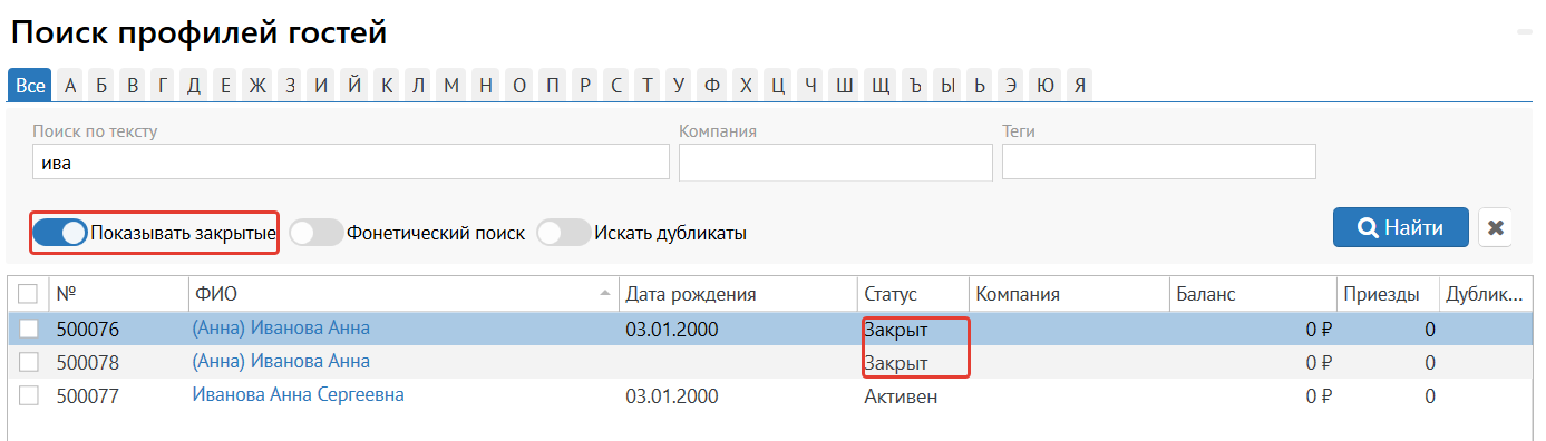 Переключатель "Показать закрытые" - позволяет показывать закрытые профили гостей.