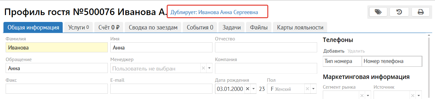 На вкладке "Гости" отображаются все имеющиеся профили гостей.