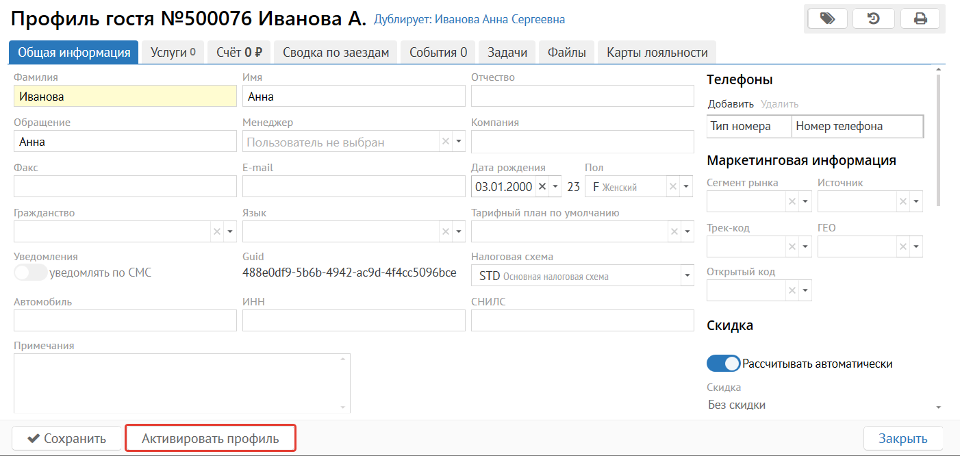 Для активации закрытых профилей необходимо в профиле гостя нажать кнопку "Активировать профиль":