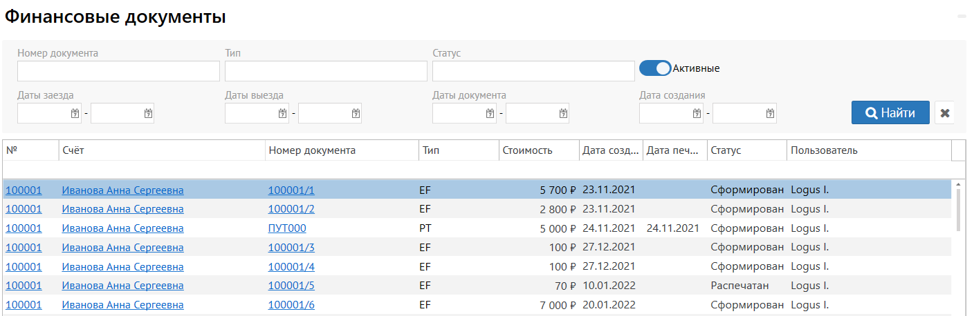 На вкладке "Финансовые документы" отображаются все созданные финансовые документы: