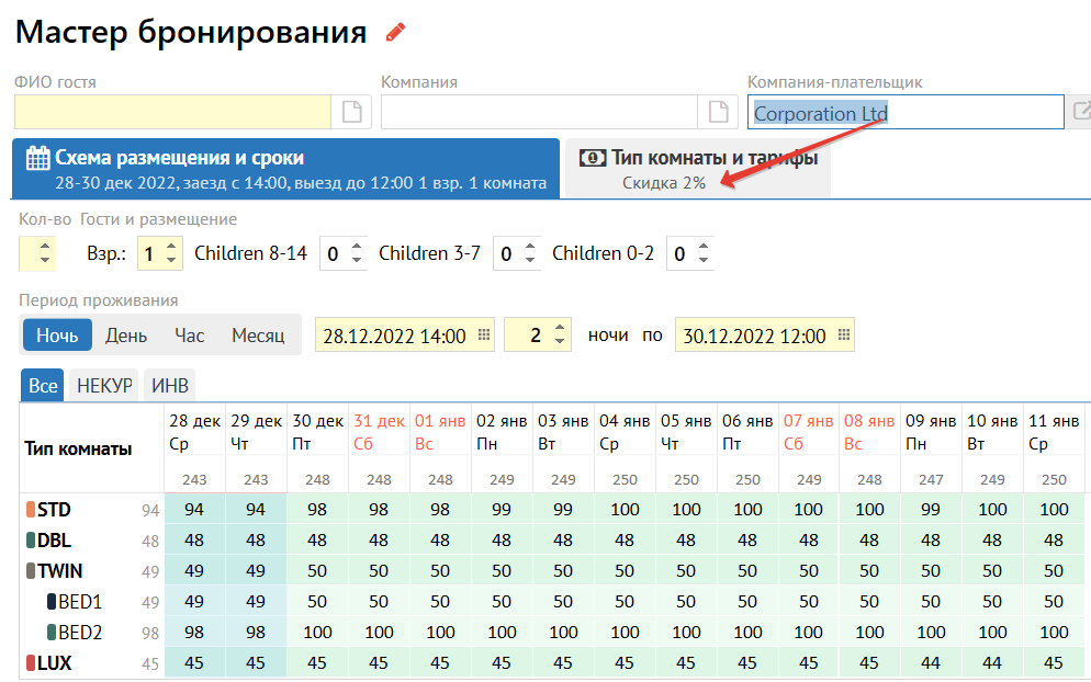 При создании брони от данной компании-плательщика, указанная скидка будет применяться автоматически.