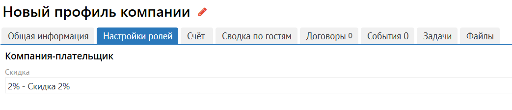 При активации переключателя появляется дополнительная вкладка "Настройки ролей", в которой есть возможность указать постоянную скидку, за частые приезды гостей от компании. Таким образом, при создании брони от данной компании-плательщика, указанная скидка будет применяться автоматически.