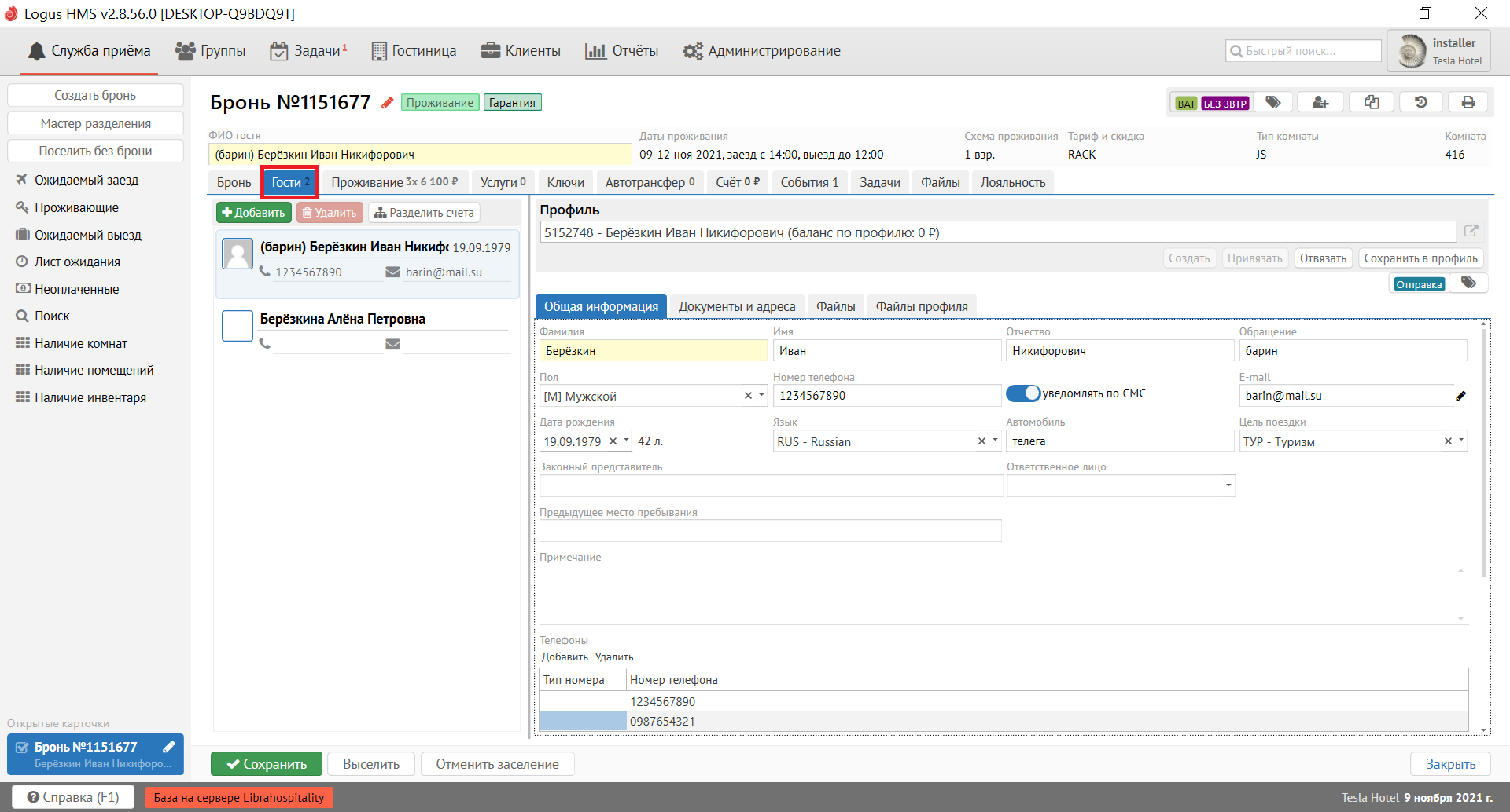 Номер телефона - основной номер телефона гостя. Дополнительные номера можно ввести в разделе ниже.