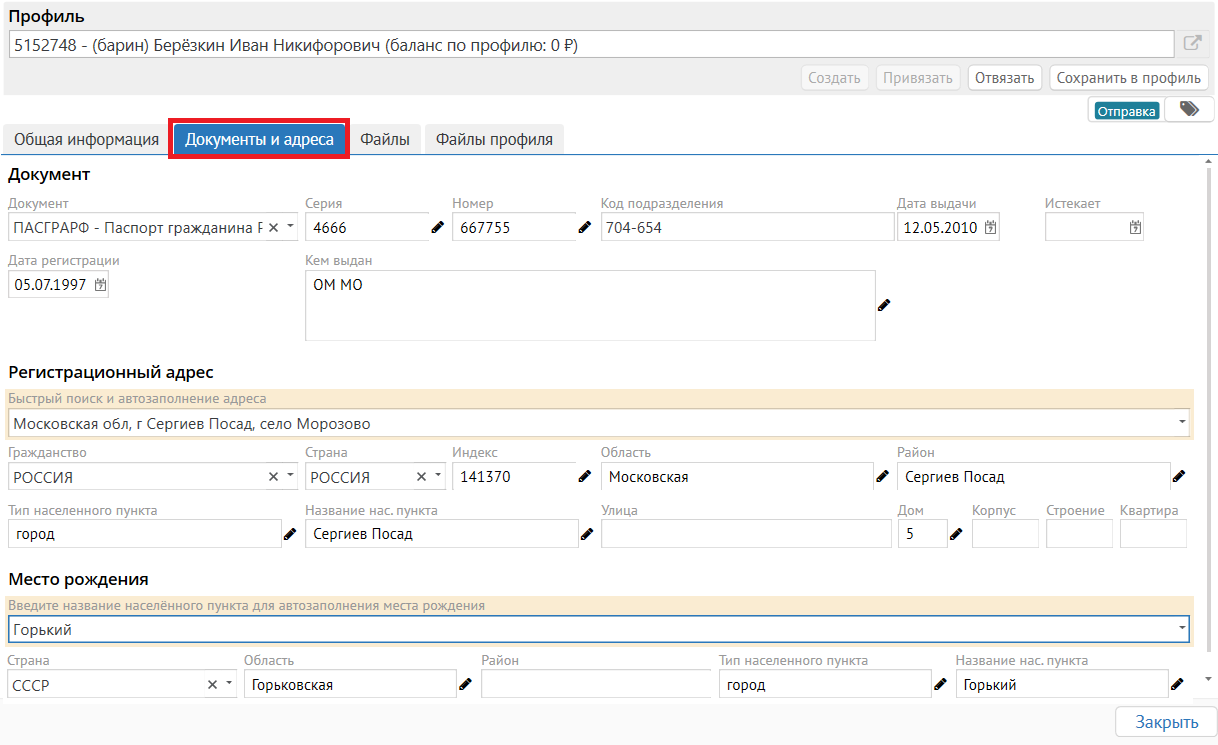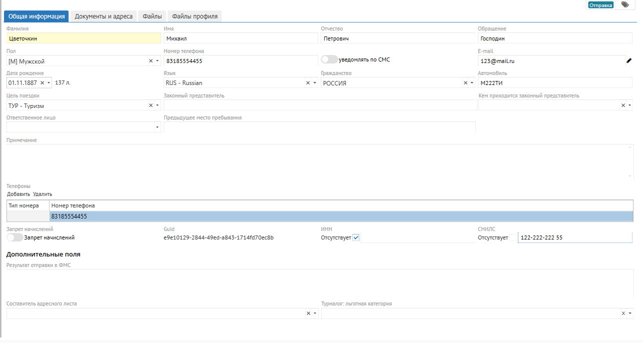 Вкладка содержит данные документов, предоставленных гостем: паспорта, свидетельства о рождении, водительских прав и других. Также на данной вкладке заполняются регистрационный адрес и место рождения.