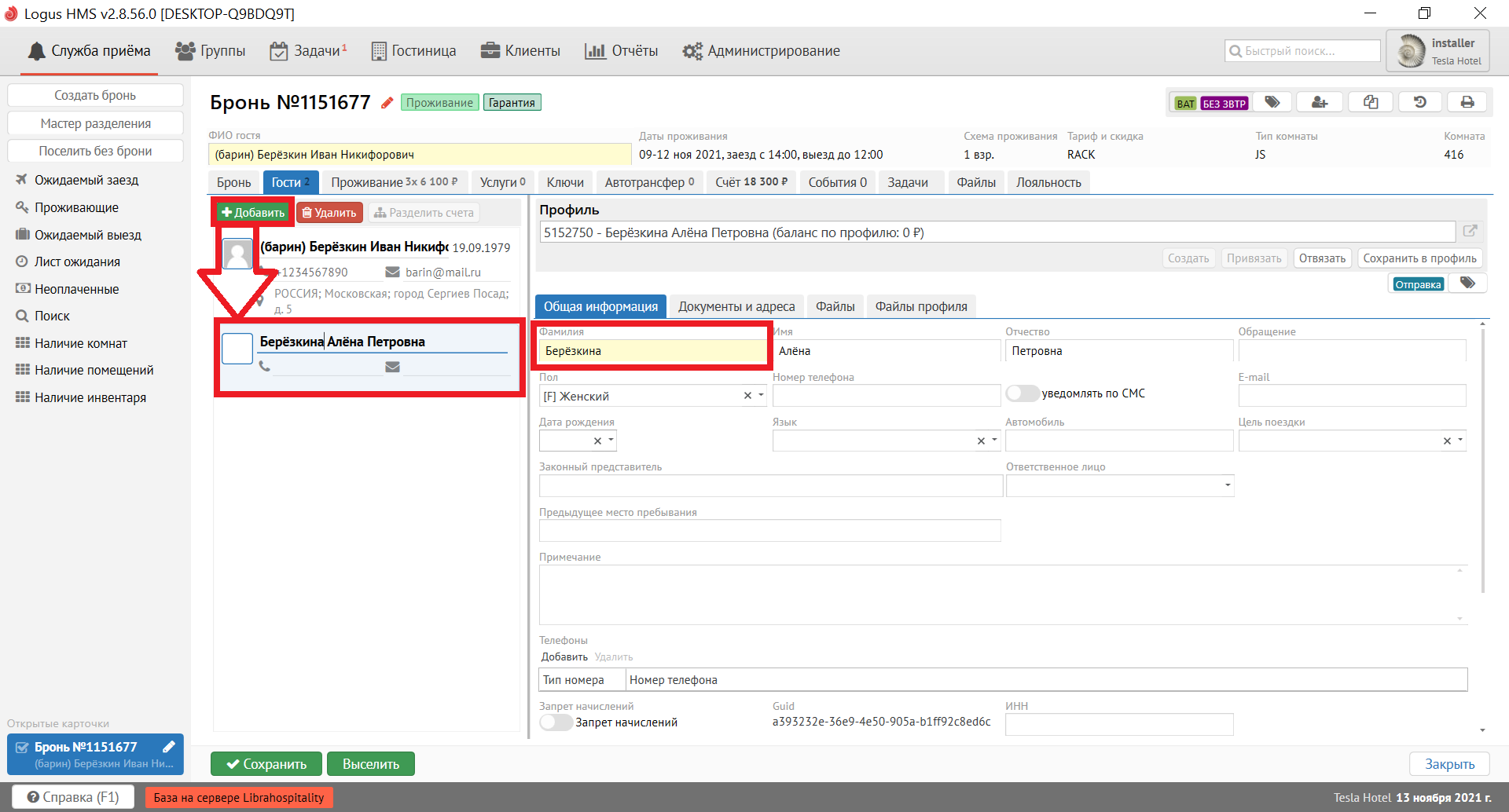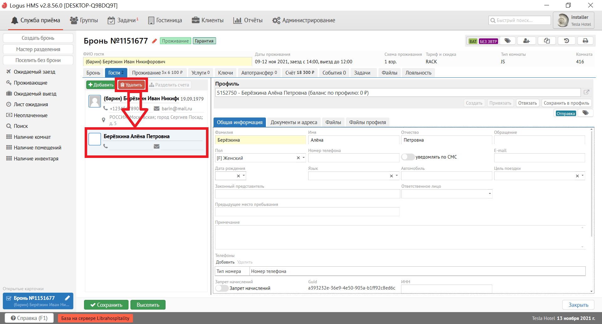 Для удаления второго и последующих гостей необходимо выделить карточку гостя в брони и нажать "Удалить". Если для гостя был создан профиль, то при удалении карточки гостя из брони профиль гостя из базы данных не удаляется.
