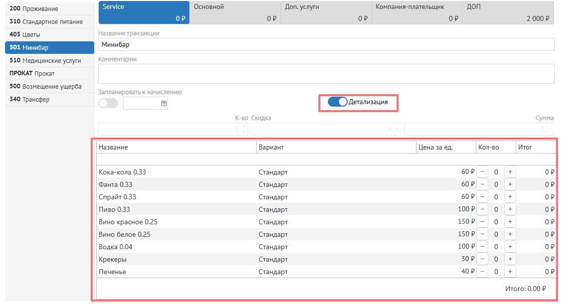 - Детализация - если начисление подразумевает какой-то набор услуг или товаров, то ФЗ-54 требует, чтобы транзакция была детализирована. При включении этого переключателя появляется возможность выбрать из списка привязанных в коду транзакции услуг нужные, указав количество.