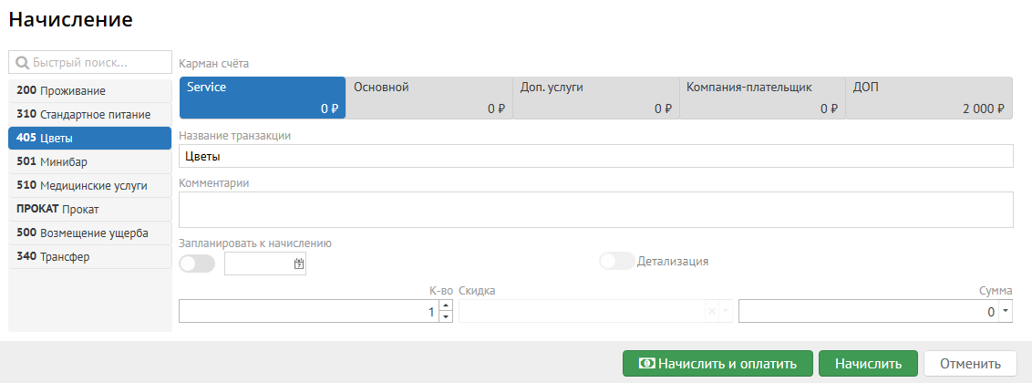 - Карман счета - выбрать карман, на который будет сделано начисление.