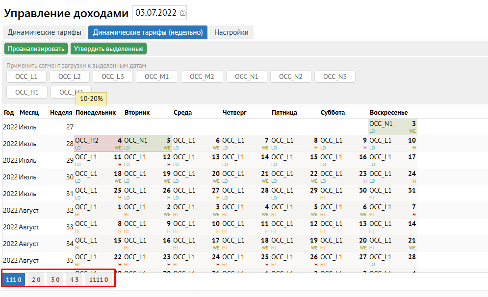 Также, на календаре отображается текущий сегмент для выбранной группы управления доходами, и есть возможность установить самостоятельно сегмент на выбранные даты.