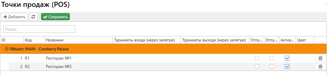 Точки продаж (POS) - справочник, который позволяет разграничить различные места отпуска услуг на объекте. Для того, чтобы добавить новую точку продаж, необходимо нажать "Добавить":