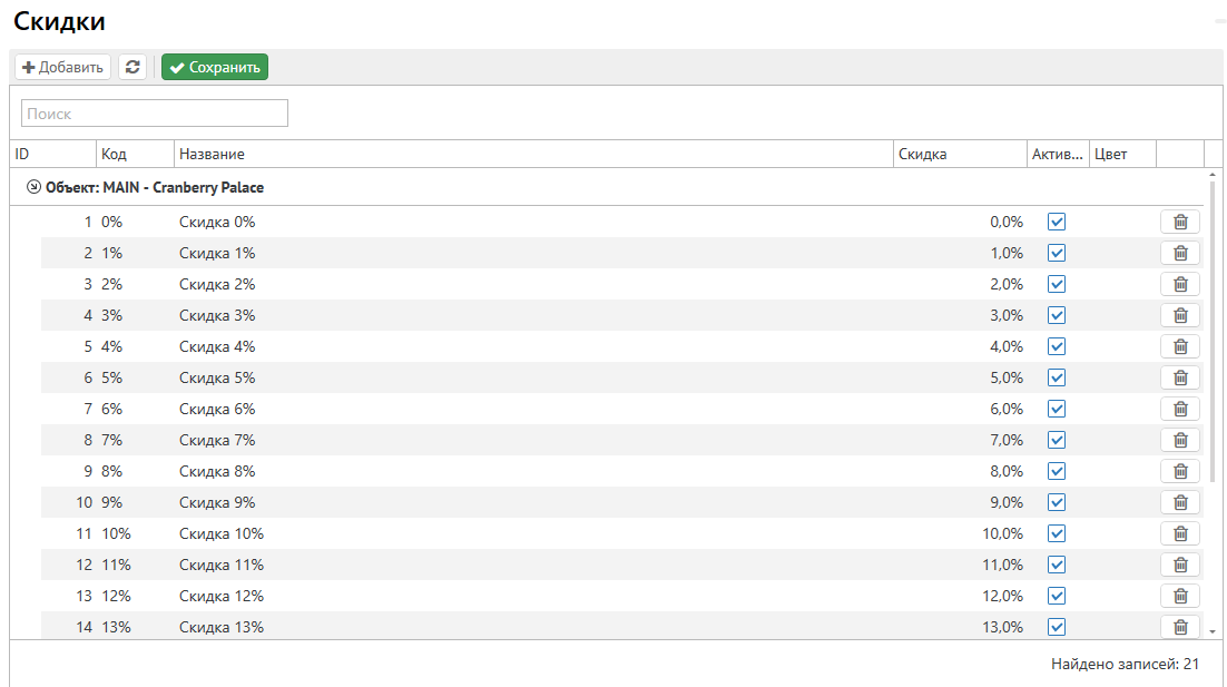 Скидки - справочник, который содержит информацию о доступных на объекте скидках. Для того, чтобы добавить новую скидку, необходимо нажать "Добавить":