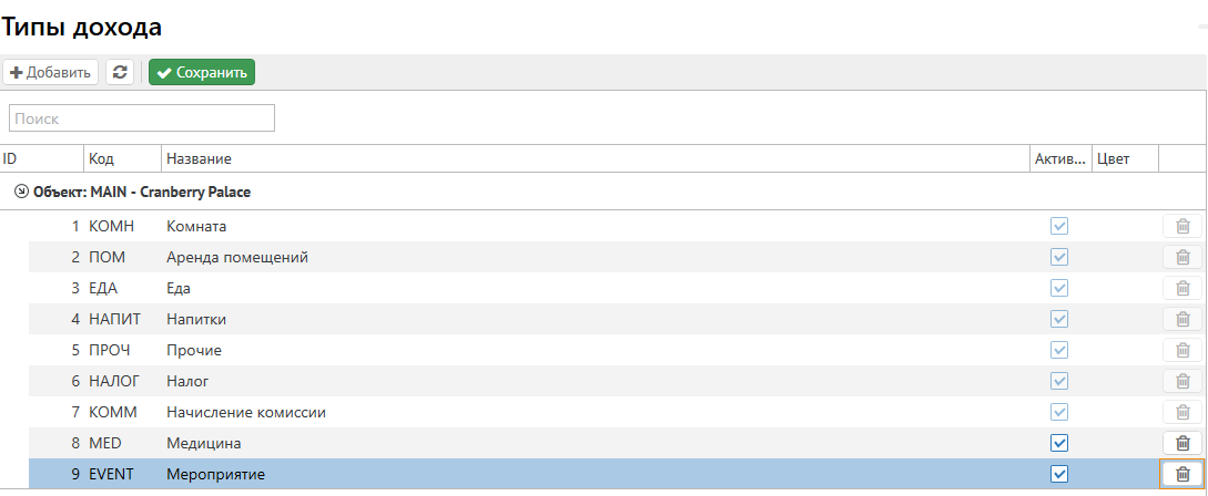 Типы дохода - справочник, который содержит информацию о доступных типах дохода, которыми пользуется объект(чаще всего нужны для отчетов). Для того, чтобы добавить новый тип дохода, необходимо нажать "Добавить":