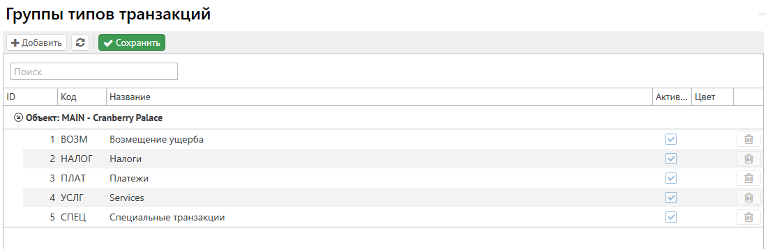 Группы типов транзакций - справочник, который используется в различных отчетах для классификации типов транзакций по группам. Для того, чтобы добавить новую группу типов транзакций, необходимо нажать "Добавить":