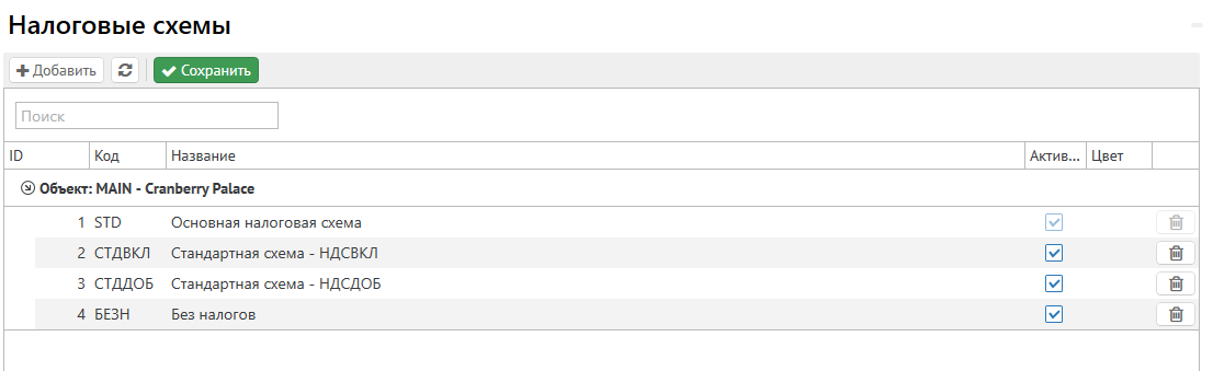 Налоговые схемы - справочник, использующийся при конфигурировании кодов транзакций. Налоговая схема выбирается на карточке брони при бронировании и от нее зависит, какой налог будет выбран в коде транзакции. Для того, чтобы добавить новую налоговую схему, необходимо нажать "Добавить":
