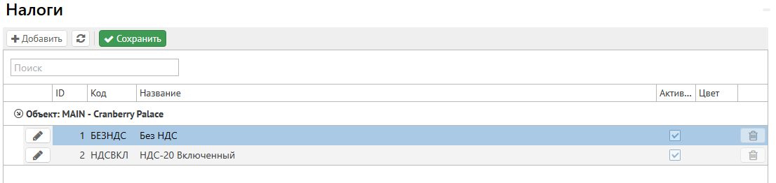Налоги - справочник, который содержит налоги, которые используются в кодах транзакций, сопоставляются с фискальным аппаратом и указываются в чеке. Налоги, считающиеся в PMS, бывают двух видов - добавочные и включенные. Типичным примером включенного налога может являться НДС, добавочного - налог с продаж, которой в России сейчас не применятся. Хотя на некоторых объектах НДС может начисляться как добавочный налог. Добавочный налог начисляется на счет гостя отдельной транзакцией, а включенный находится в основной транзакции в одной из 4-х специальных групп полей. Для того, чтобы добавить новый налог, необходимо нажать "Добавить":