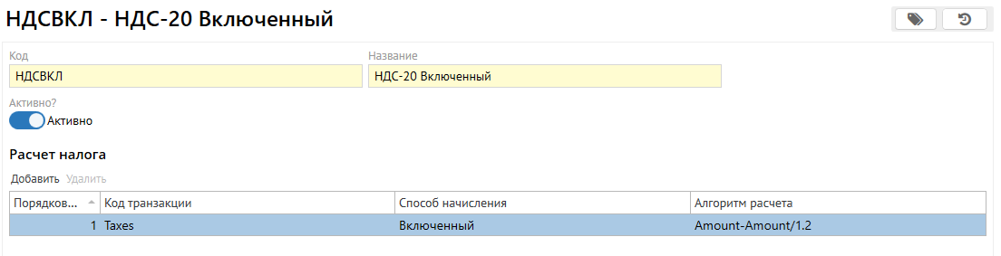 Код транзакции - код транзакции, которой начисляется налог. Стандартно используется Taxes