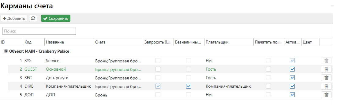 Карманы счета - справочник, который содержит информацию о доступных карманах на объекте. Карманы используются для разграничений транзакций по какому-либо признаку(например, медицина, доп.услуги, безналичный-транзакции, которые оплачивает компания-плательщик, служебный-коррекции услуг). Для того, чтобы добавить новый карман, необходимо нажать "Добавить"(рекомендуется консультация с Технической поддержкой при настройке):