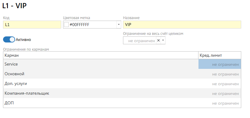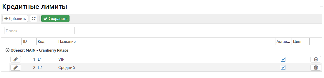 Кредитные лимиты - справочник, который содержит информацию о доступных кредитных лимитах на объекте. Кредитные лимиты используются для ограничения начислений на карман в положительную(лимит) или отрицательную(депозит) сторону. То есть, при установке кредитного лимита на карман, либо нельзя начислять в долг, либо должна быть какая-то сумма, чтобы можно было начислять. Для того, чтобы добавить новый кредитный лимит, необходимо нажать "Добавить":