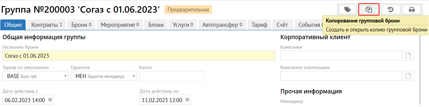 С версии 2.9 появилась возможность создавать копию карточки группы с помощью кнопки "Копирование групповой брони".