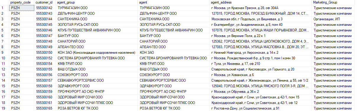 | agent_address | nvarchar(max) | Юридический адрес компании | |