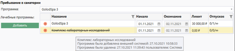 В случае удаления пакета в Логусе в Санаториуме также удаляется ЛП, при наведении отображается детальная информация: