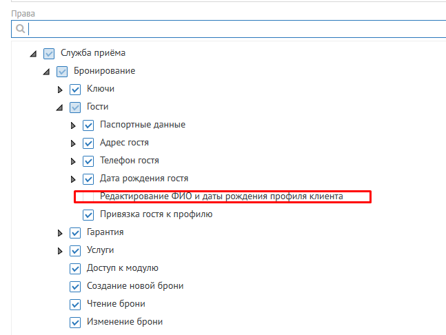 Для ситуаций, когда персонал на стойке изменяет ФИО гостей в брони на совершенно других людей, не обращая внимания на то, что гость привязан к профилю, в результате чего, бронь оказывается привязана к абсолютно к нерелевантному профилю, не имеющего никакого отношения к гостю в профиле, введено дополнительное право "Редактирование ФИО и даты рождения профиля клиента":