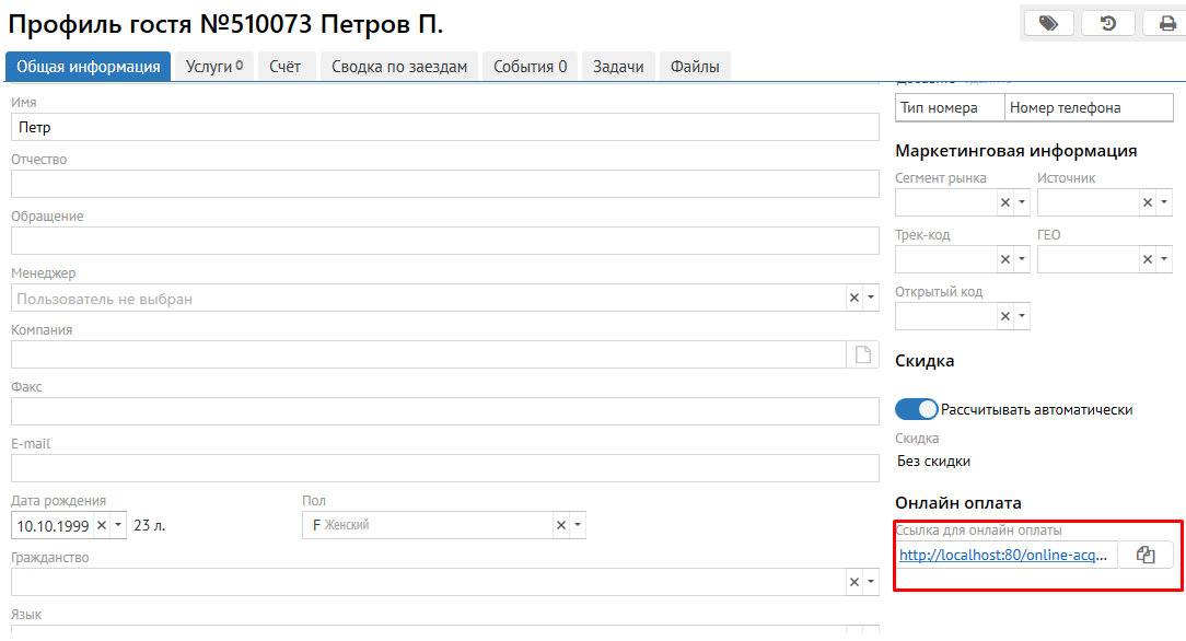 Онлайн-эквайринг: добавлена ссылка на карточке группы и профиле гостя