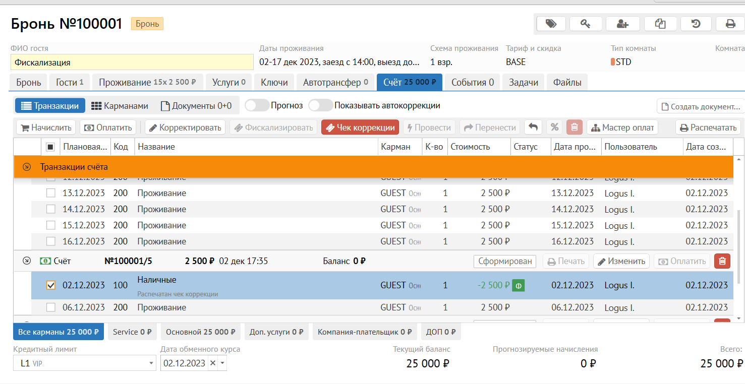 После активации права на счетах появляется кнопка "Чек коррекции", которая активна только если выделить операцию оплаты, фискализированную ранее.