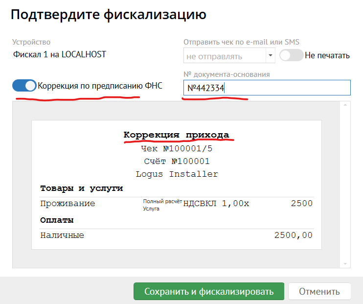 По нажатию на эту кнопку система отобразит знакомый диалог подтверждения фискализации, за исключением того, что тип данного чека будет "коррекция прихода", и будут доступны 2 дополнительных признака для ввода данных: