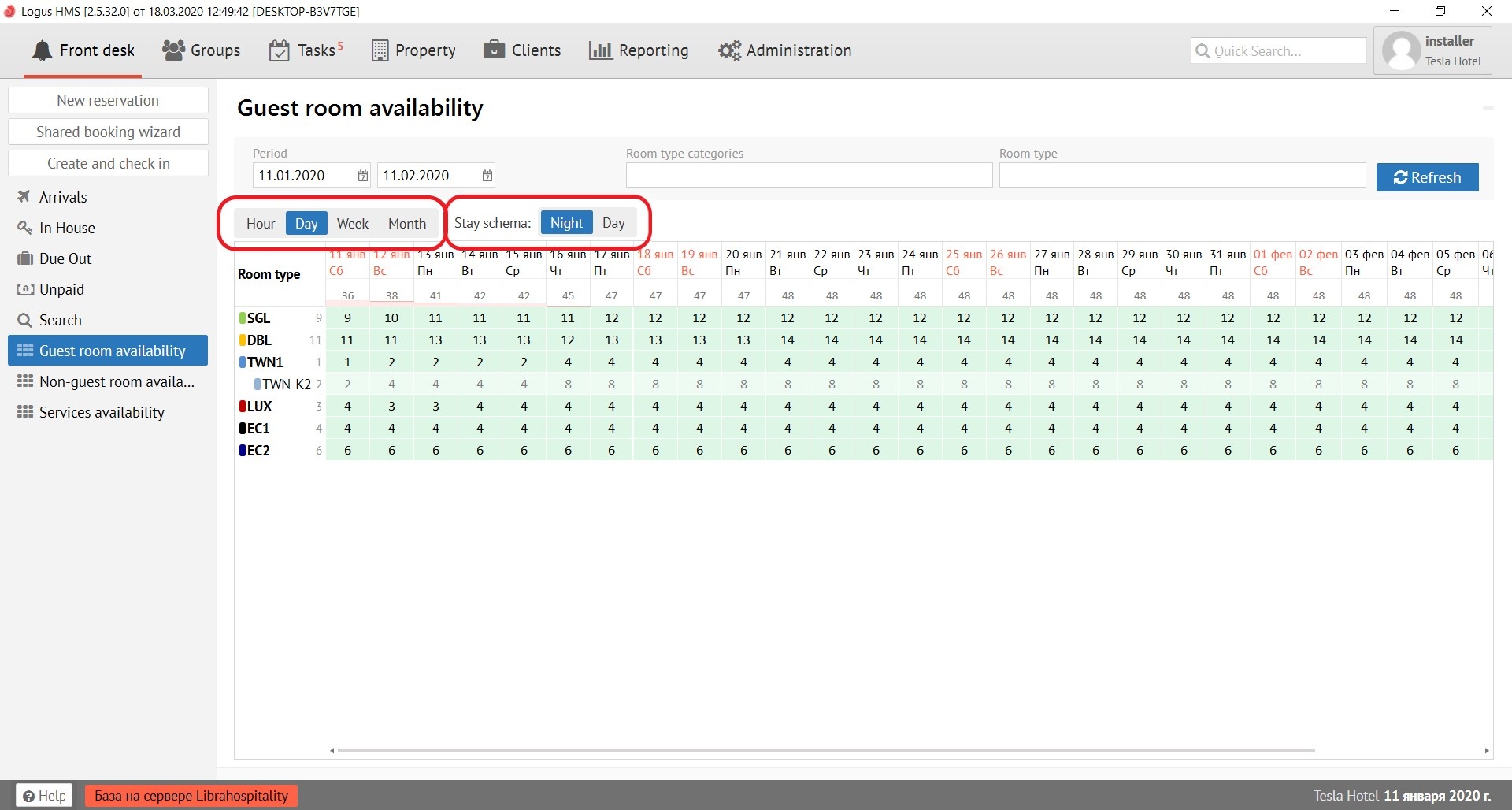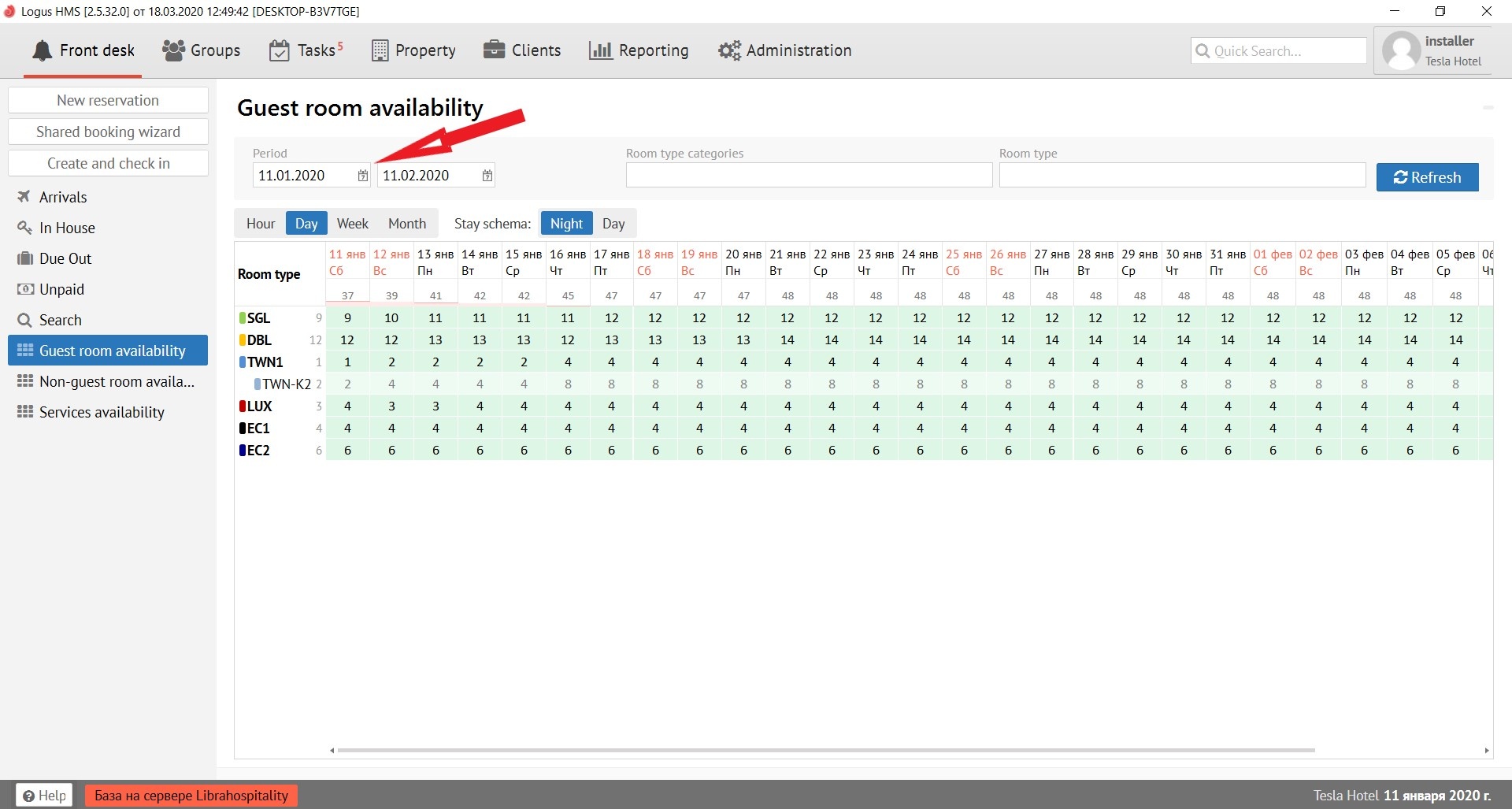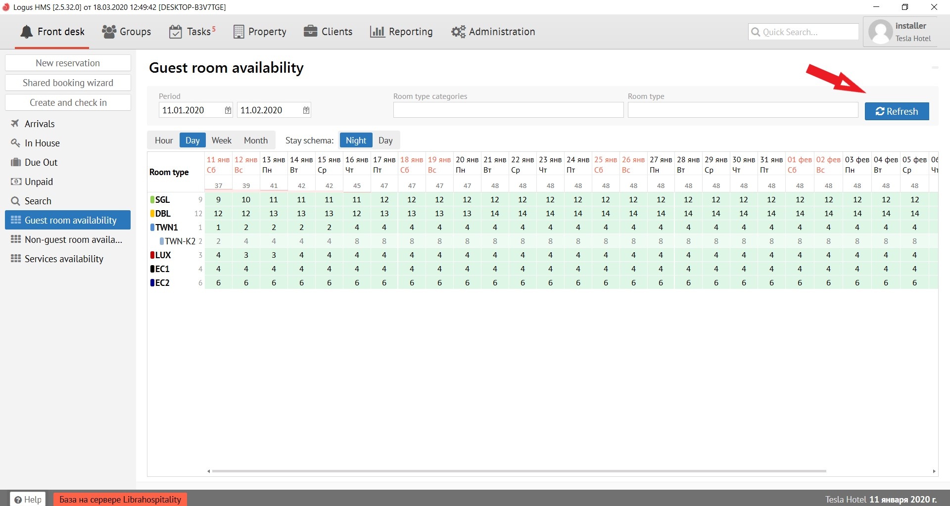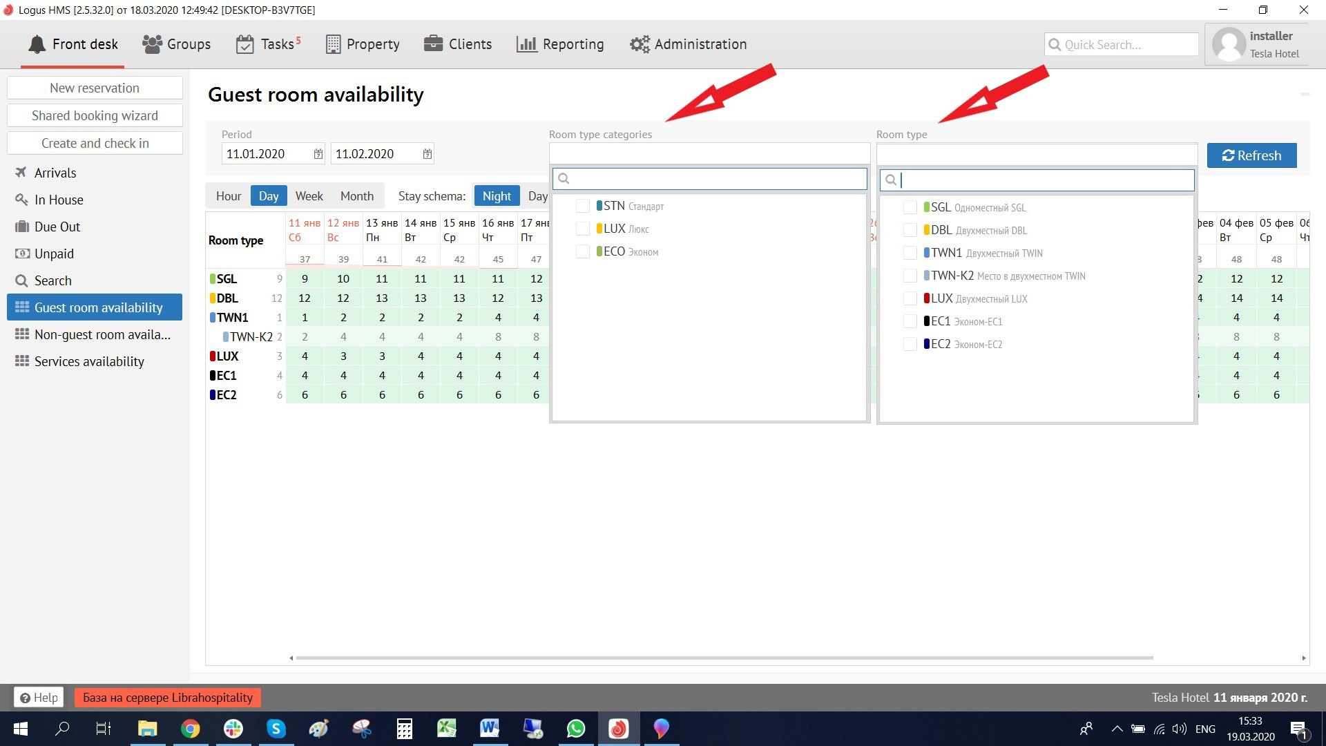 “Room type categories” is selected the category of room types. To the right of it is the "Room Type" field, which is a filter for the room types selected in it (SNGL, DBL, TWN, etc.) To get the result click the "Refresh" button.