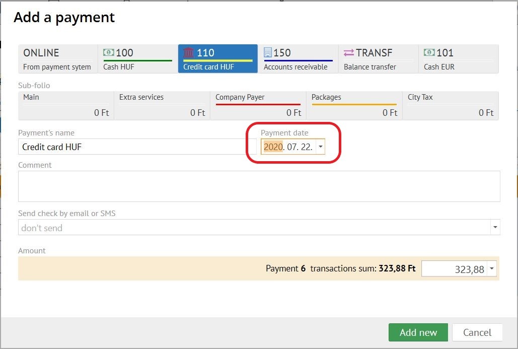 Go to “Folio” “Add payment”, select the needed currency, select payment date (to fix the rate) and enter the amount of payment in currency.