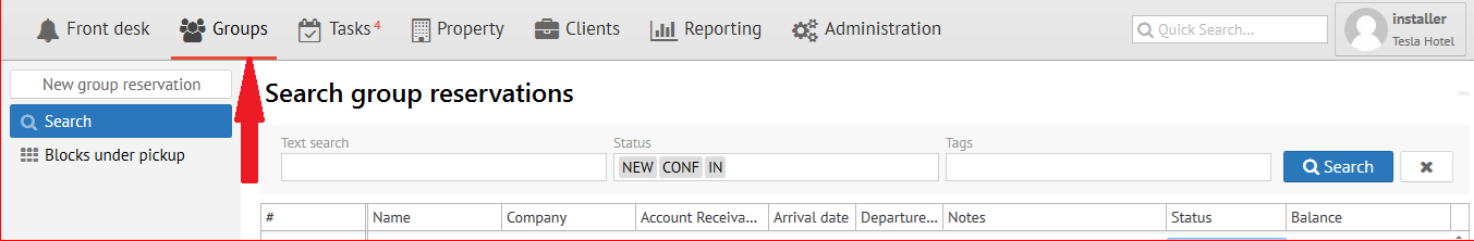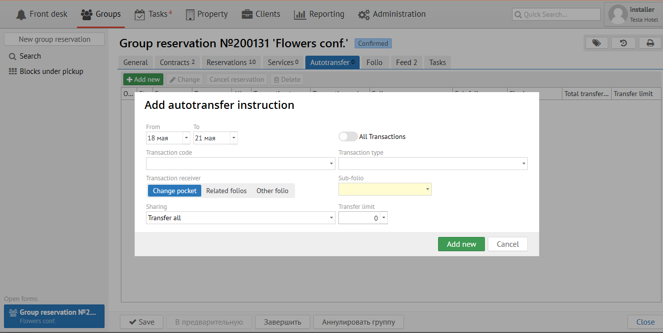 To make a new group reservation press the button "New group reservation". You will see the next screen: