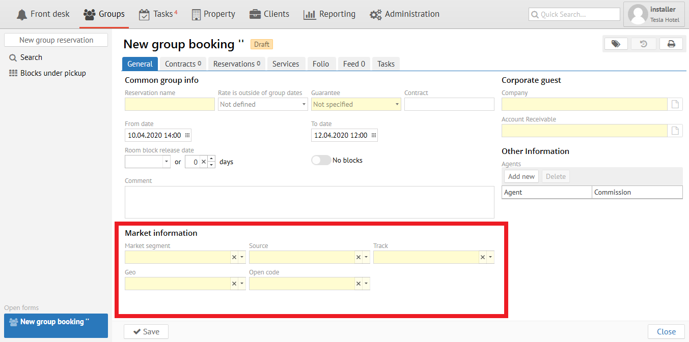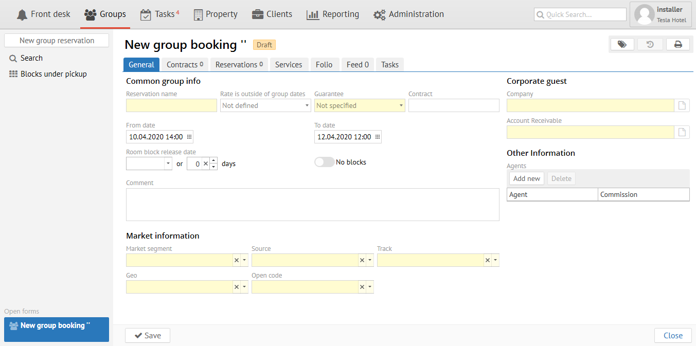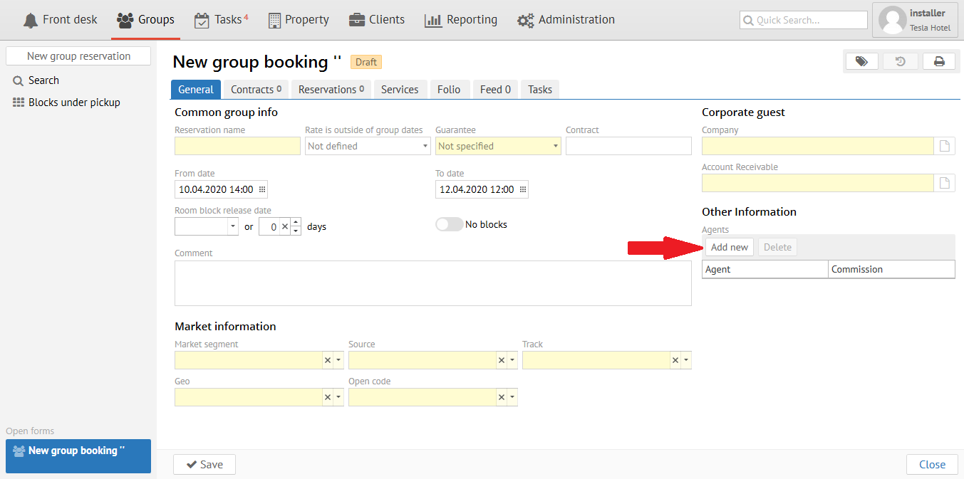 Click "New" button and choose Agent from the list in special field in case of Group come from Travel Agency and you should pay comission.
