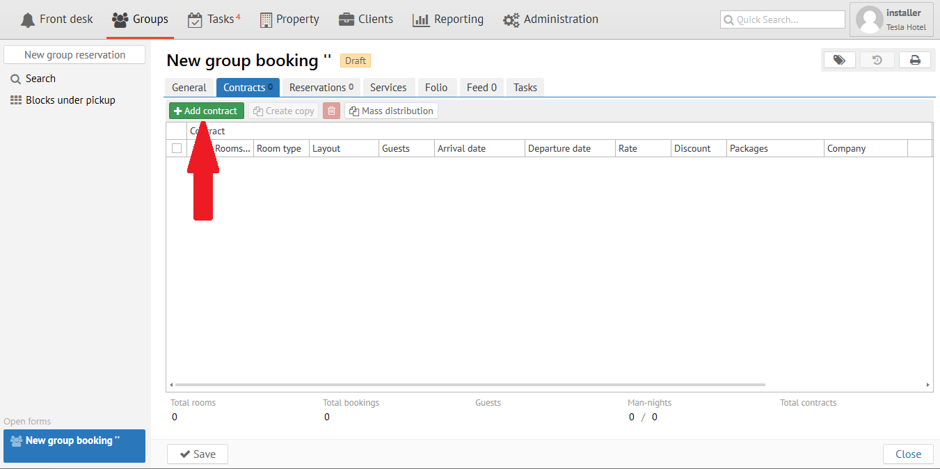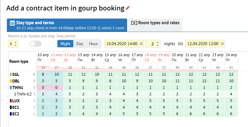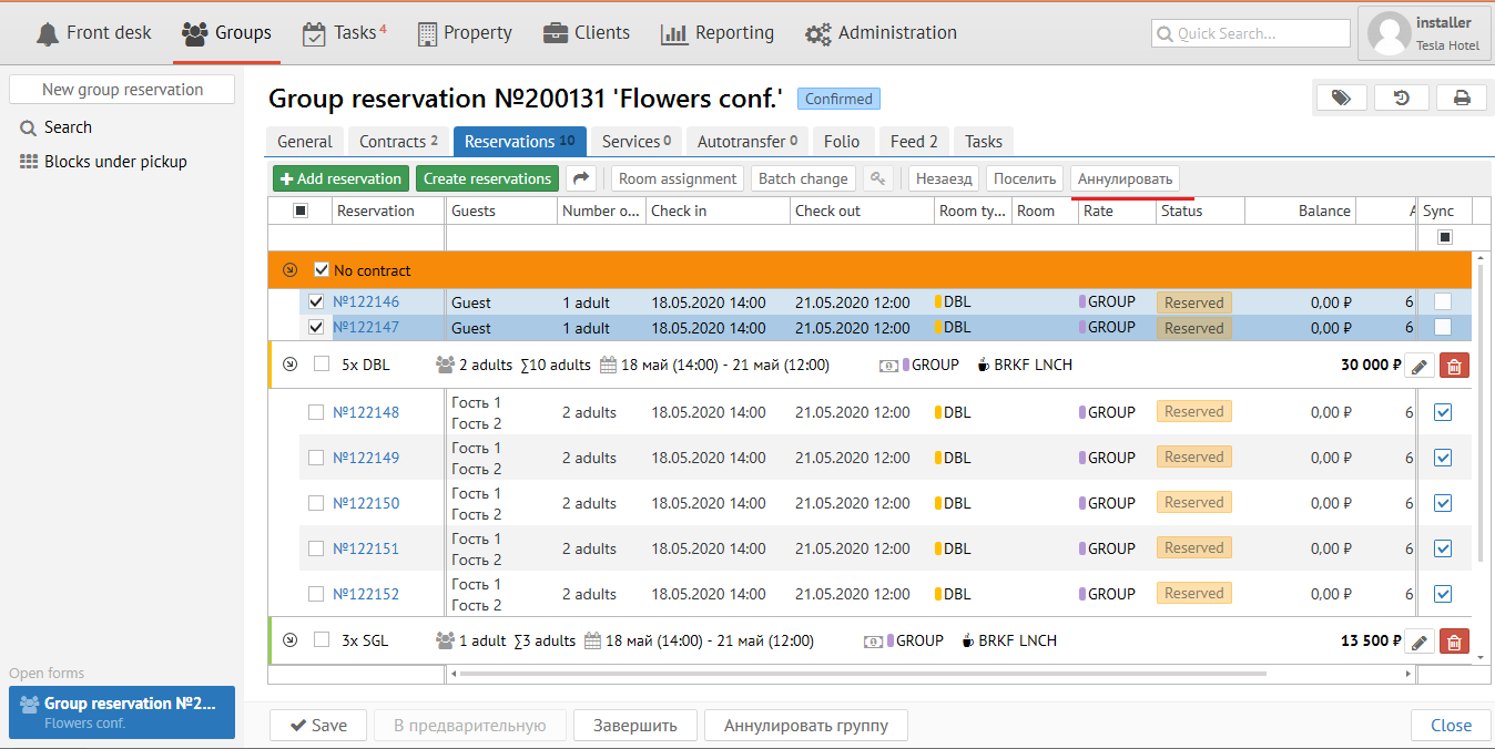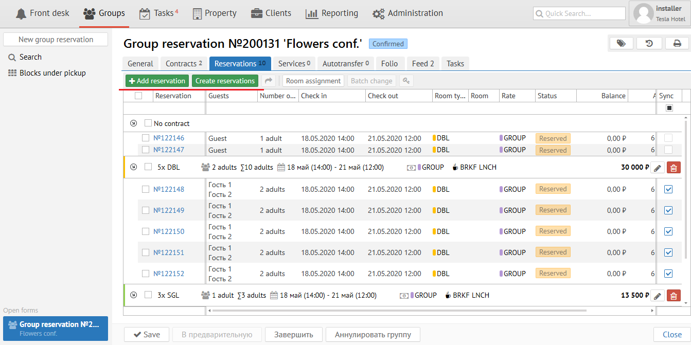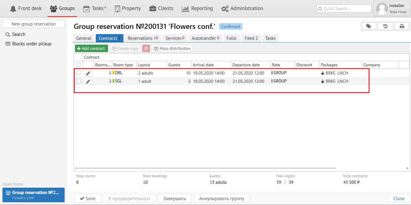 It is necessary to press "В предварительную" button for turning Contract to Block (change status for Confirm contract). After that necessary quantity of rooms (blocks) will be "frozen" for this Group.
