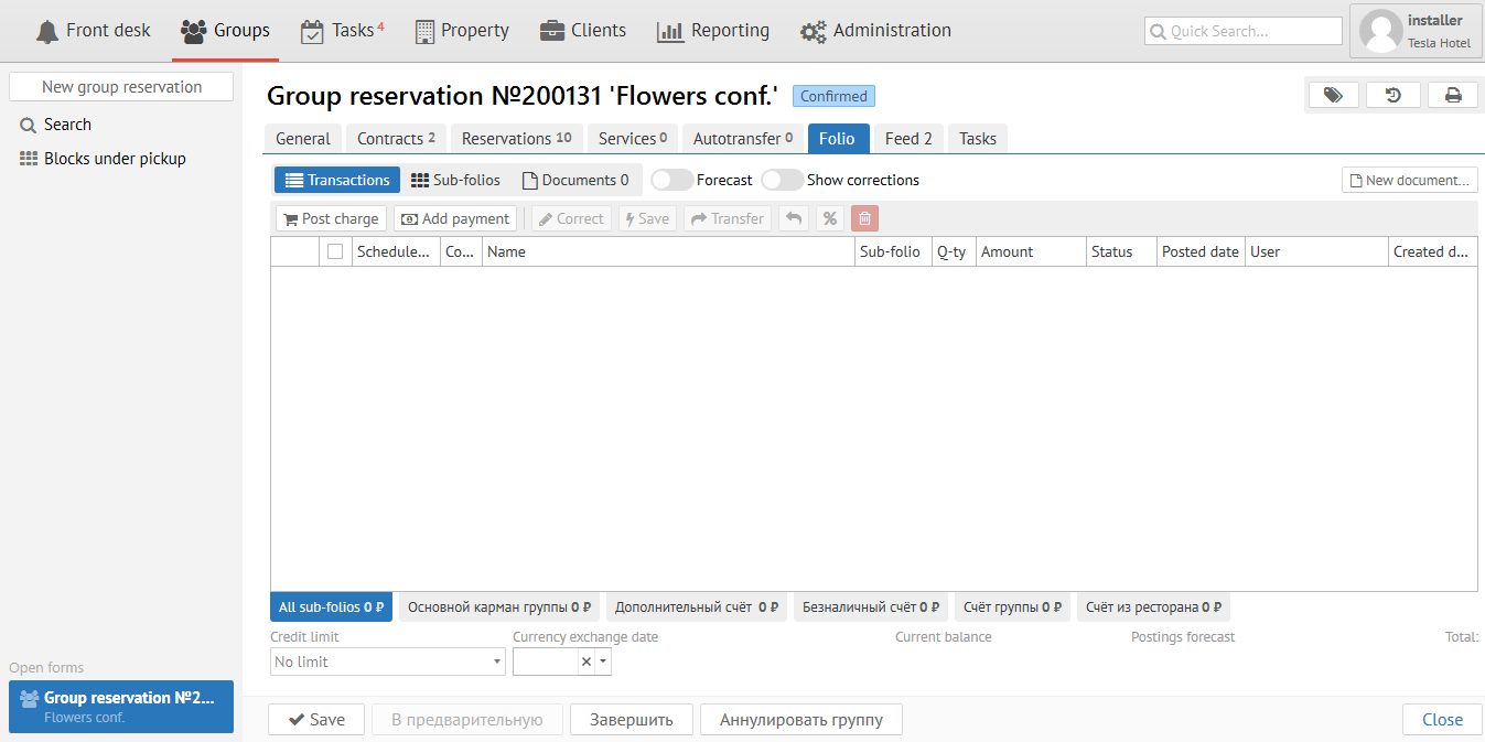 "Folio" tab - group folio (bill) where transactoins appear after Autotransfer setup.