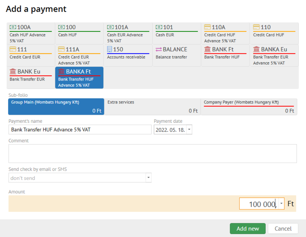 1. Goto Folio Section. Click the "Add payment" button and select the desired Advance payment method.