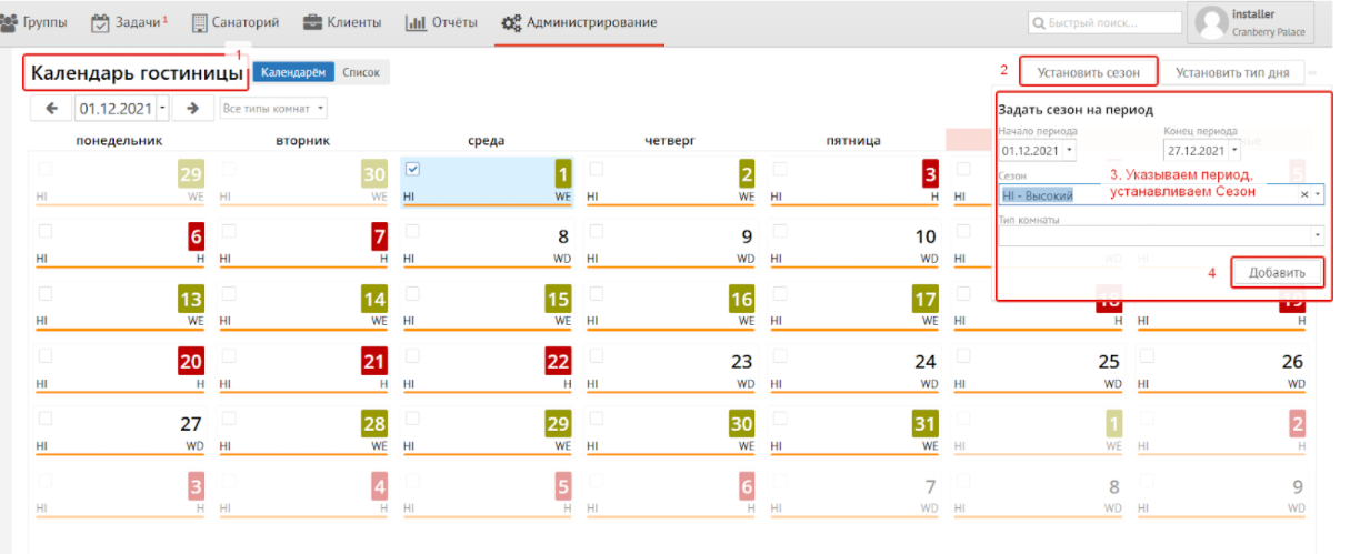 2. В справочнике “Календарь гостиницы” задается периоды сезонов: